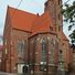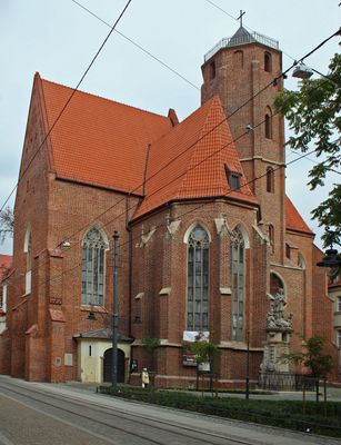 Saint Matthew Church stands at Bishop Nankier Square with its brick walls and Gothic spire reaching toward the sky of central Wrocław.