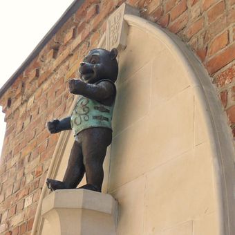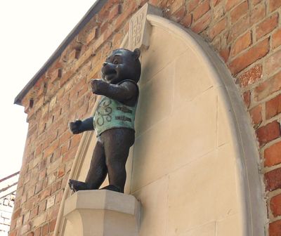 Since 2010, this bronze bear serves as the official mascot of Gniew, wearing different outfits including chainmail, nobility attire, and firefighter costume.
