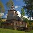 The church stands next to a brick bell tower from 1820, located 8 kilometers southwest of Rymanów and 18 kilometers south of Krosno.