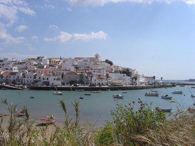 The settlement stretches across hillside terraces overlooking the Arade River, with whitewashed houses cascading down to the waterfront fishing harbor.