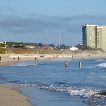 The 2.7-kilometer sandy coastline of Praia de Ofir extends along the Atlantic Ocean, bordered by pine woods and divided by two concrete piers.