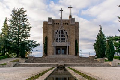 The Santuário da Penha is a church in Costa featuring modern architecture built on elevated ground in Guimarães with clean lines and geometric forms. The structure sits prominently on the mountainside, creating a bold focal point visible from various angles in the surrounding area.