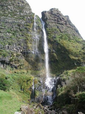 Cascata do Poço do Bacalhau is a waterfall on Flores Island in the Azores that drops approximately 90 meters from the central highlands. The cascade flows into a natural basin where the water remains clear and still at its base.