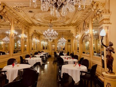 Tavares is a fine dining establishment in a classical building that features ornate chandeliers, mirrored walls, and detailed plasterwork throughout its dining rooms. The space combines formal architectural elements with an elevated dining experience.