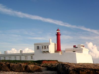 The cylindrical metallic tower of Cabo Raso Lighthouse stands 13 meters tall with a red exterior, lantern, and observation balcony at Fort São Brás.