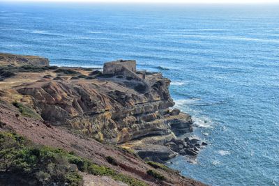 The Fort of Milreu features a rectangular layout with a terrace roof, two cylindrical watchtowers, and several cannon positions facing the Atlantic Ocean.