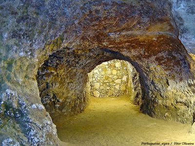 The underground network consists of multiple stone-carved galleries extending beneath the medieval village, forming an extensive subterranean complex at coordinates 39.495431, -8.552808.