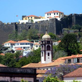 The Fortaleza de São João Baptista do Pico stands on a hill overlooking Funchal, with thick stone walls and strategic defensive positions facing the Atlantic Ocean.