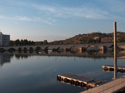Ponte Velha sobre o rio Tua, Stone bridge crossing Rio Tua in Mirandela, Portugal