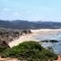 The one-kilometer stretch of golden sand sits between red and ochre cliffs, with multiple connected bays forming a continuous shoreline.