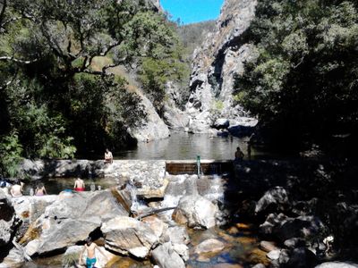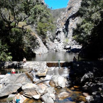 The location offers established climbing routes on surrounding crags, while smaller rock formations serve as natural diving platforms into the river.