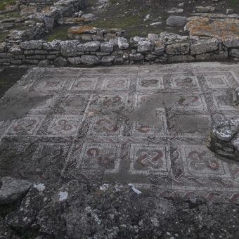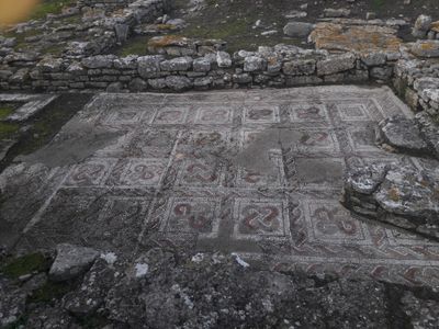 The ruins contain sections of Roman walls, geometric mosaic flooring, and an apsidal structure built with horizontally arranged stones from the second century.