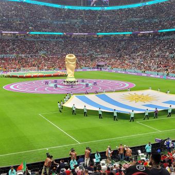 The stadium's design incorporates geometric patterns inspired by Islamic art and traditional Gulf culture, with its exterior resembling a classic lamp that symbolizes light and hospitality in the region.
