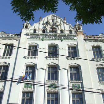 The three-story educational building features early 20th-century architectural elements with distinctive eclectic-Secession design patterns across its entire exterior facade.