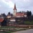 The church stands on a hill with a 29-meter tower and features a three-nave layout with Gothic architectural elements from the 13th century.