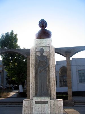 The bronze monument features a tall bust of the poet Mihai Eminescu mounted on a travertine pedestal with a female figure at the base.