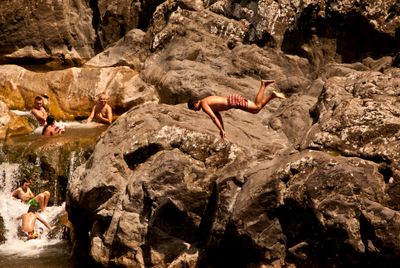 Local residents gather at the waterfall during summer festivals to share stories and celebrate traditional Romanian customs in the natural setting.
