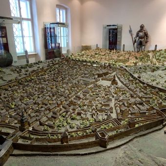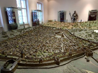 The fortress displays architectural elements from different periods, including a stone inscription from 1630 showing the city emblem at its entrance.