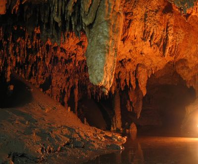 Access to the cave requires specialized diving equipment to navigate through chambers and a natural lake before reaching the elevated Art Gallery section.