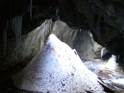 The cave is accessible year-round, though temperatures remain below freezing particularly during winter and spring, making warm clothing and sturdy footwear necessary. Access requires roughly a two-hour walk through the surrounding plateau terrain.
