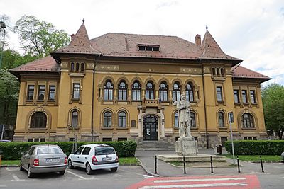 The George Baritiu County Library building stands at 35 Eroilor Boulevard, containing over 670,000 publications across multiple departments and reading rooms.
