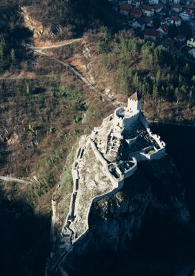 The stone fortress stands on a steep cliff surrounded by the Đetinja River, featuring remnants of defensive walls and a citadel structure.