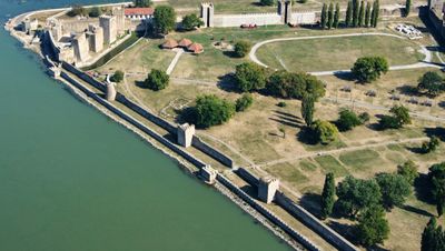 The fortress extends across 11.3 hectares along the Danube River, featuring 25 towers and thick stone walls arranged in a triangular layout.