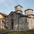 The stone monastery complex includes a church with a cylindrical dome, narrow windows, and a bell tower added during the nineteenth century.