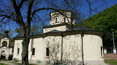 This Serbian Orthodox monastery stands in a hilly area near Svrljig, featuring traditional architectural elements of religious structures in eastern Serbia.