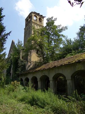 The estate includes a family chapel decorated with angel paintings, representing the architectural preferences of early 20th-century Serbian nobility.