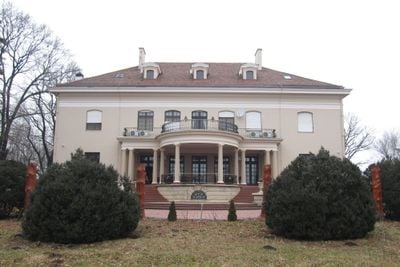 The two-story manor features classicist and baroque architectural elements, including stained glass windows and a wooden coffered ceiling in the main lounge.