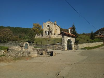 The Church of Saint Petka stands with Mediterranean and Byzantine architectural elements, featuring a bell tower and enclosed complex in Gradašnica village near Pirot.