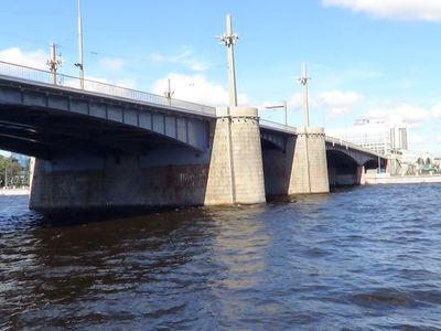 The bridge operates on a scheduled lifting system from April to November, allowing larger vessels to pass through the Bolshaya Nevka River during nighttime hours.