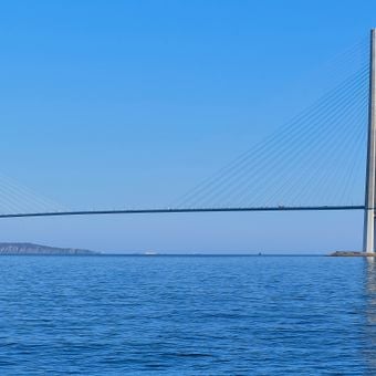 Russky Bridge is a cable-stayed bridge in Vladivostok that stretches across the strait between the mainland and the offshore island. The two main pylons rise high into the air and carry steel cables that support the deck over a span of more than one kilometer.