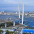 The bridge design resembles seagull wings extended over the Golden Horn Bay, reflecting the maritime character of Vladivostok and its connection to the Pacific Ocean.