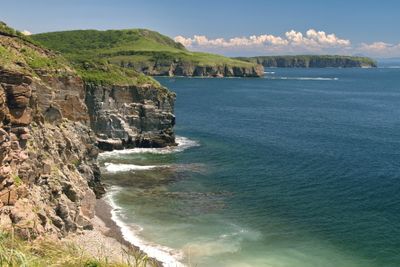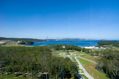 Russky Island is the largest landmass in the Empress Eugénie Archipelago within Peter the Great Gulf and sits just east of mainland Vladivostok. The shoreline alternates between sandy beaches steep cliffs and sheltered coves while pine and deciduous trees cover rolling hills.