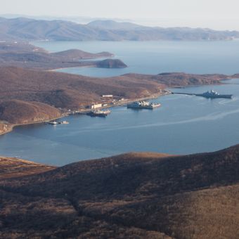 Fokino is a closed town situated along the Peter the Great Gulf coast in Primorsky Krai. The settlement rises about 40 meters above sea level and spreads across the landscape overlooking Abrek Bay.
