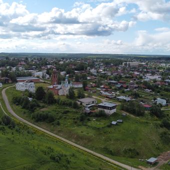 Cherdyn is a town in northern Perm Krai, located along the Kolva River and surrounded by forests and rolling hills. The settlement sits at about 160 meters elevation and contains several historic churches with religious artwork dating from past centuries.