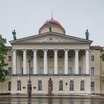 The Pushkin House occupies the former Customs House building, designed by architect Giovanni Francesco Lucchini in neo-Palladian style along the Neva River.