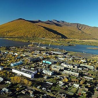 The settlement extends along the Kamchatka River at the point where the watercourse shifts its direction from north to east at 30 meters elevation.