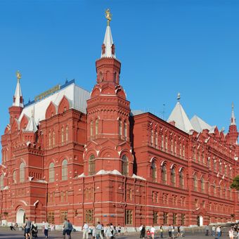 The State Historical Museum is a history museum on Red Square in Moscow, Russia. The exhibition spreads across forty halls inside a red brick building and shows objects, documents, and artworks from all phases of Russian history.