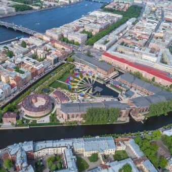 New Holland Island is an artificial island in the Admiralteysky District of Saint Petersburg bordered by canals and containing restored 18th-century brick warehouses. The grounds include a public park with lawn areas, waterfront walkways and covered courtyards between the historic storage buildings.