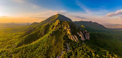 Mount Beshtau features five distinct domed peaks rising to 1,401 meters, with slopes covered in deciduous forests and a treeless summit area.