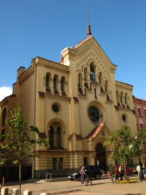 The Evangelical Lutheran Church of Saint Katarina is a white stone building featuring Romanesque Revival design, with tall windows lining its exterior walls. The structure displays the hallmark architectural characteristics of this style and forms an important visual landmark in the area.