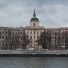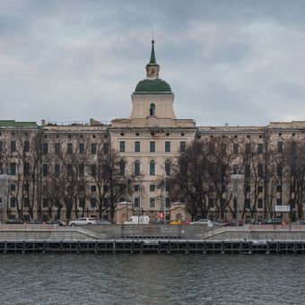 The Moscow Orphanage stretches 379 meters along the Moskva River, featuring intricate architectural details and a spired belvedere near the embankment.