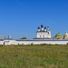 Belopesotsky monastery is an Orthodox monastery in Stupino situated on the Oka River. The complex features white stone buildings with five domes and traditional Russian Orthodox architectural elements arranged along the riverbank.