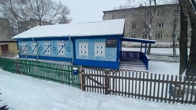 The Beit T'shuva synagogue features a wooden structure with low ceilings and a tin roof, following traditional Siberian architectural patterns.