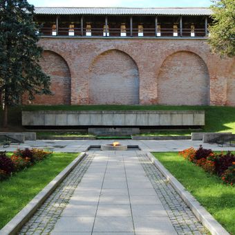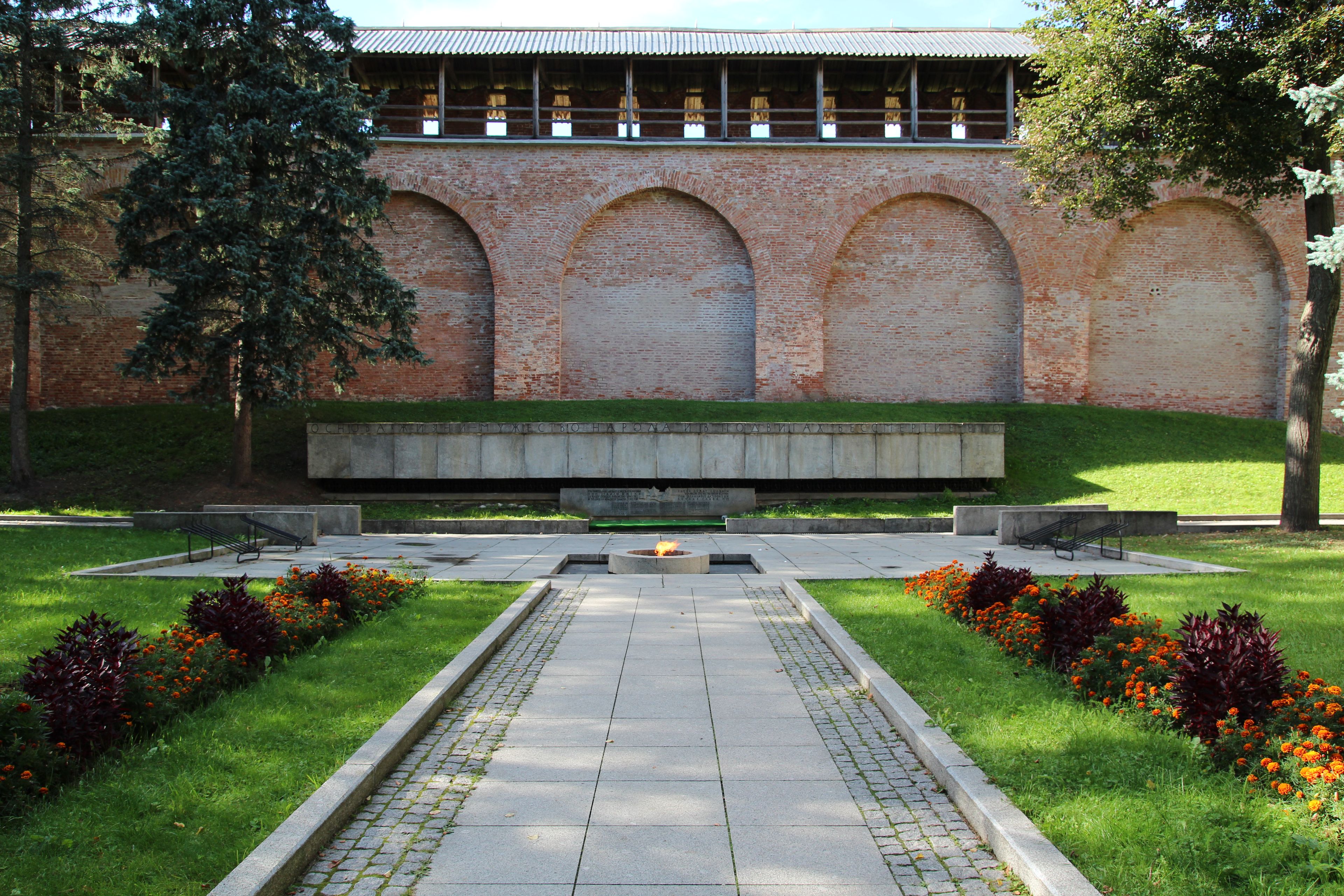The Eternal Flame Memorial stands between the Voskresenskaya Arch and Zlatooust Tower within the Novgorod Kremlin, marking a place of remembrance.