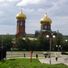 The Church of the Ascension of Christ exhibits Russian-Byzantine architectural elements with domes and decorative features characteristic of Eastern Orthodox religious buildings.