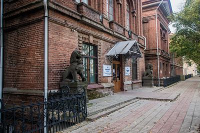 The building sits downtown on Pushkinskaya Street and is easy to reach by foot or local transport. Visitors can view the exterior on weekdays to appreciate its architectural features and historical placement in the city.